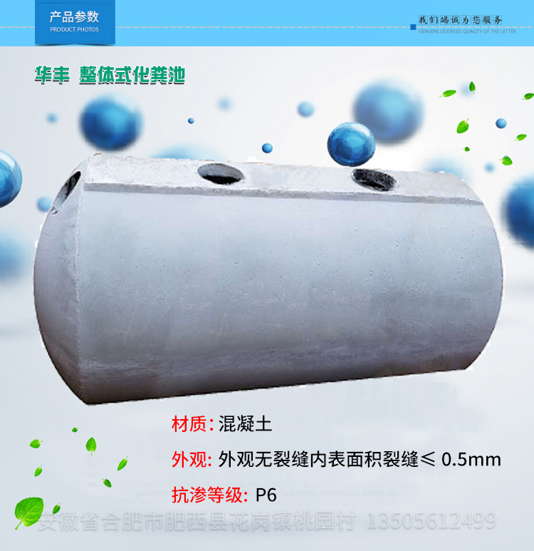 水泥化粪池具有坚固耐用、经济环保、造价经济、使用寿命长、施工方便、耗时短模具和底盘为一整体,热膨胀系数小,脱模容易快捷,移动方便等特点。
